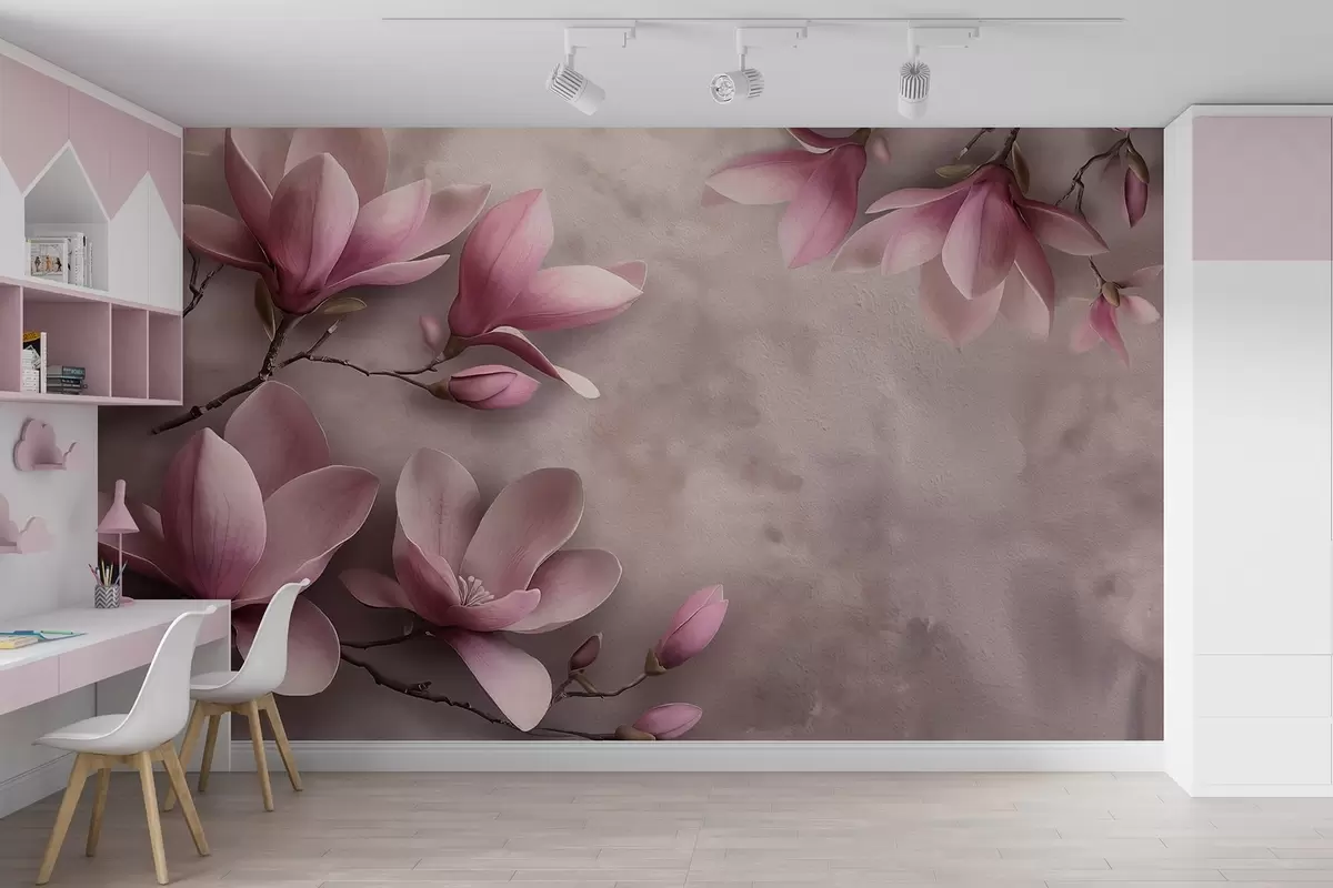 Тапете за зид Нежне ружичасте магнолије на бетонском зиду бр. w08636