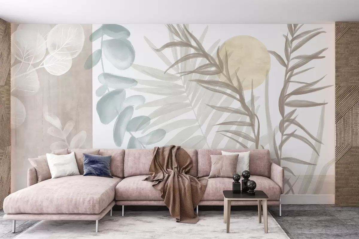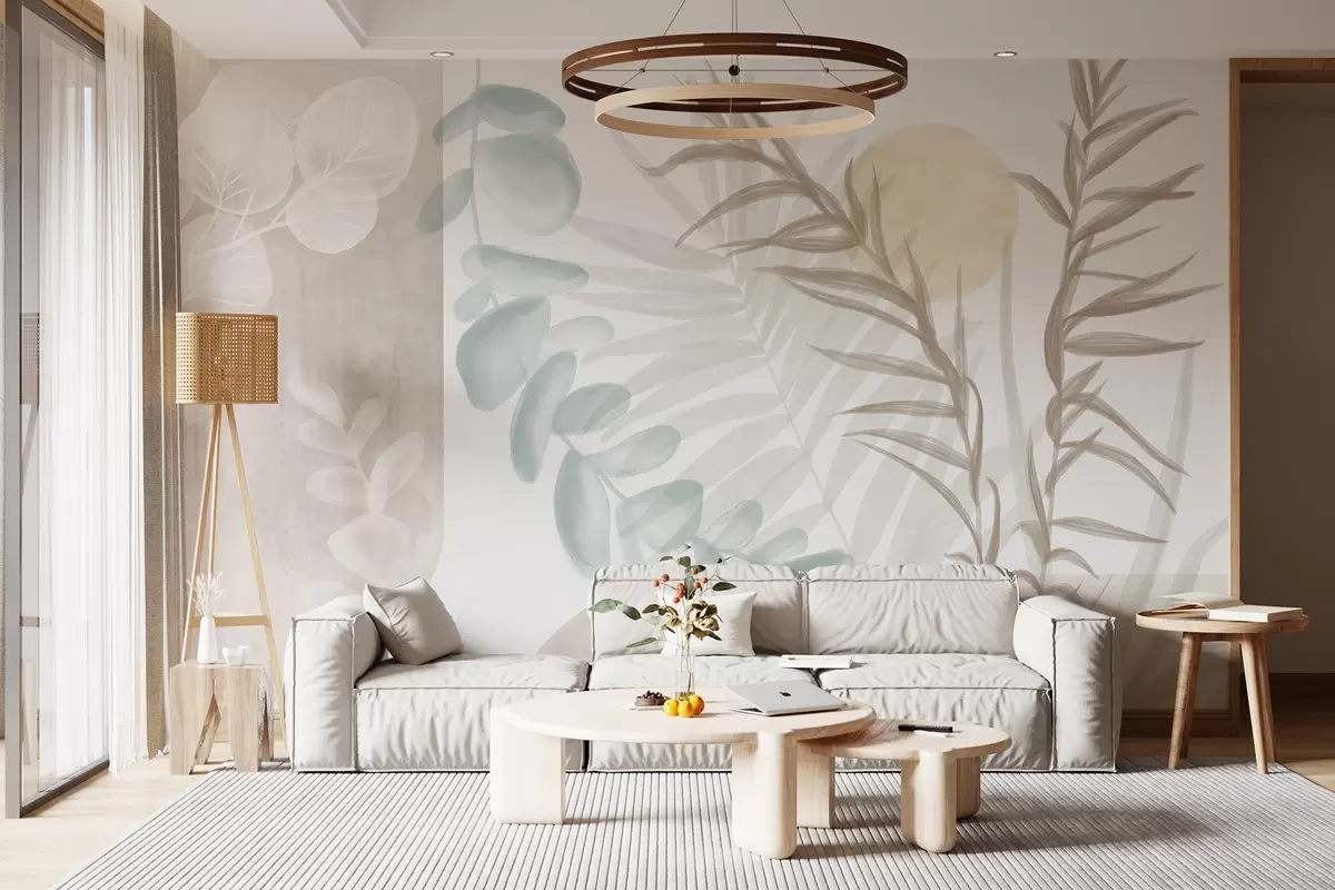 Тапете за зид Минималистички апстрактни принт са стилизованим листовима и еукалиптусом са меким, беж органским облицима у пригушеним пастелним бојама бр. w08648