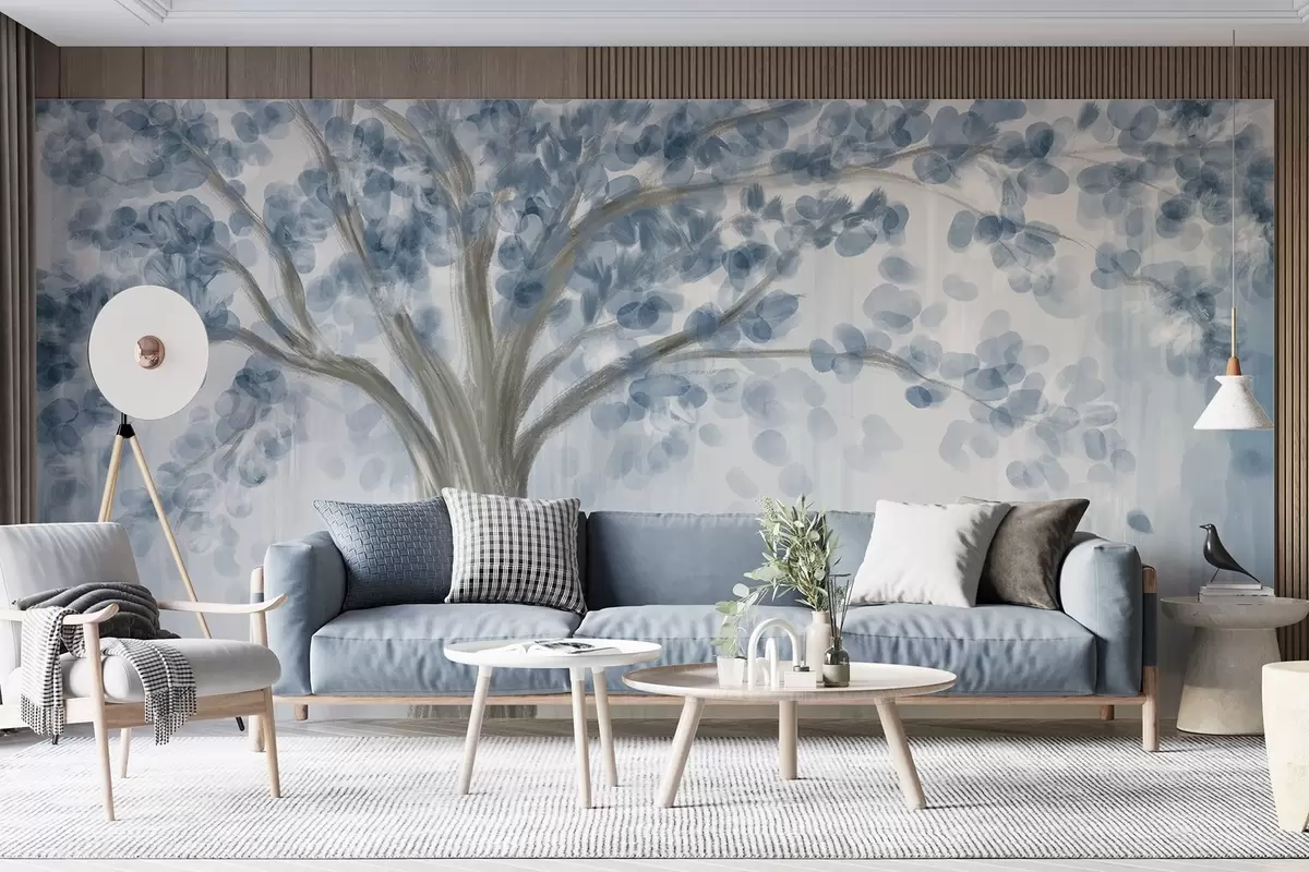 Тапете за зид Велико дрво са меким, апстрактним листовима плаве боје на светлој, неутралној позадини које појачава тонове дрвета бр. w08669v1