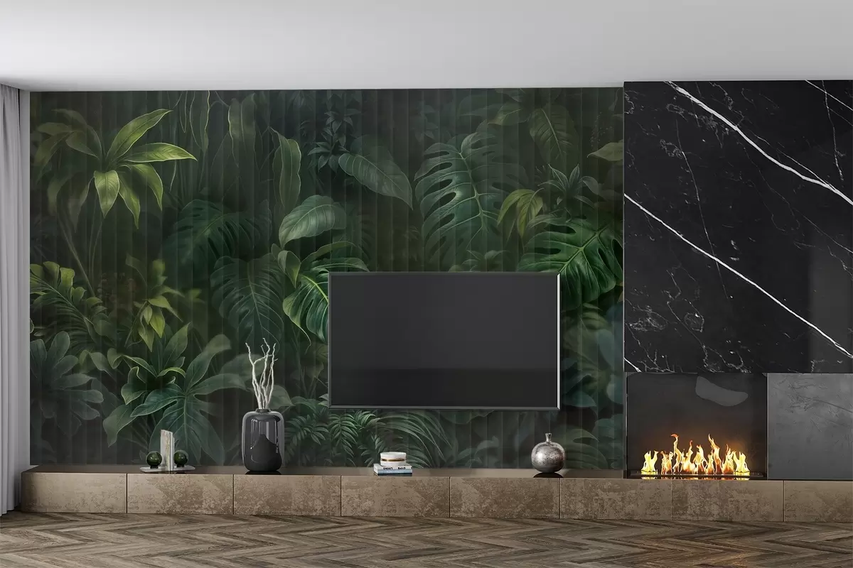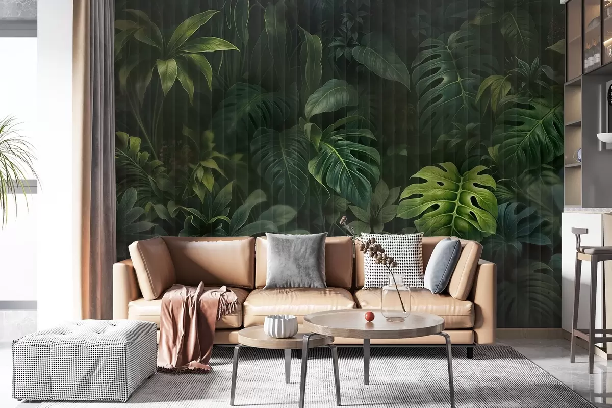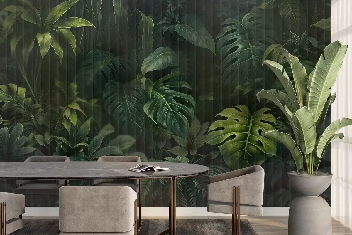 Тапете за зид Тропски тамно замућен и текстуриран отисак са разним зеленим листовима, укључујући лишће чудовишта и палми бр. w08673