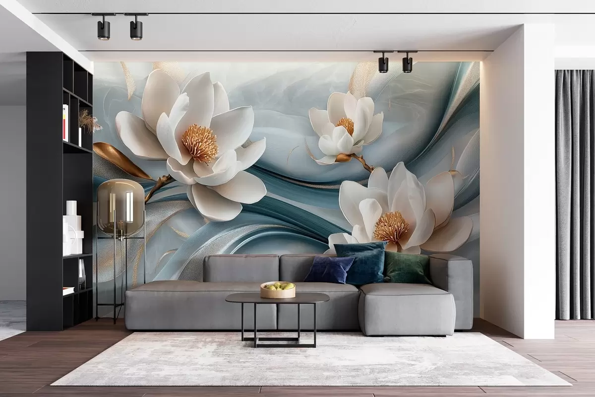 Тапете за зид Цвеће магнолије у комбинацији са плавим, белим и жутим тоновима са апстрактним таласима бр. w08695