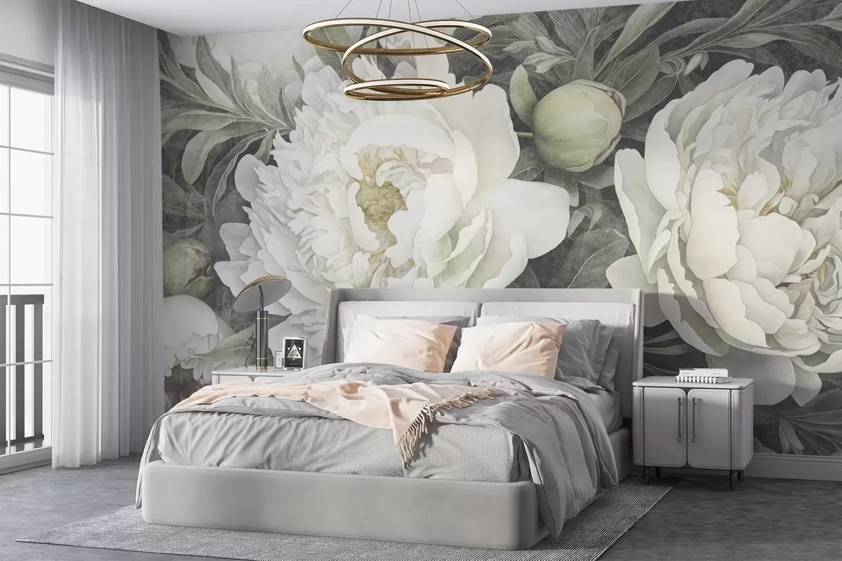Тапете за зид Текстурирани пастелни бели божури са меким зеленим пупољцима и листовима са деликатним латицама бр. w08697