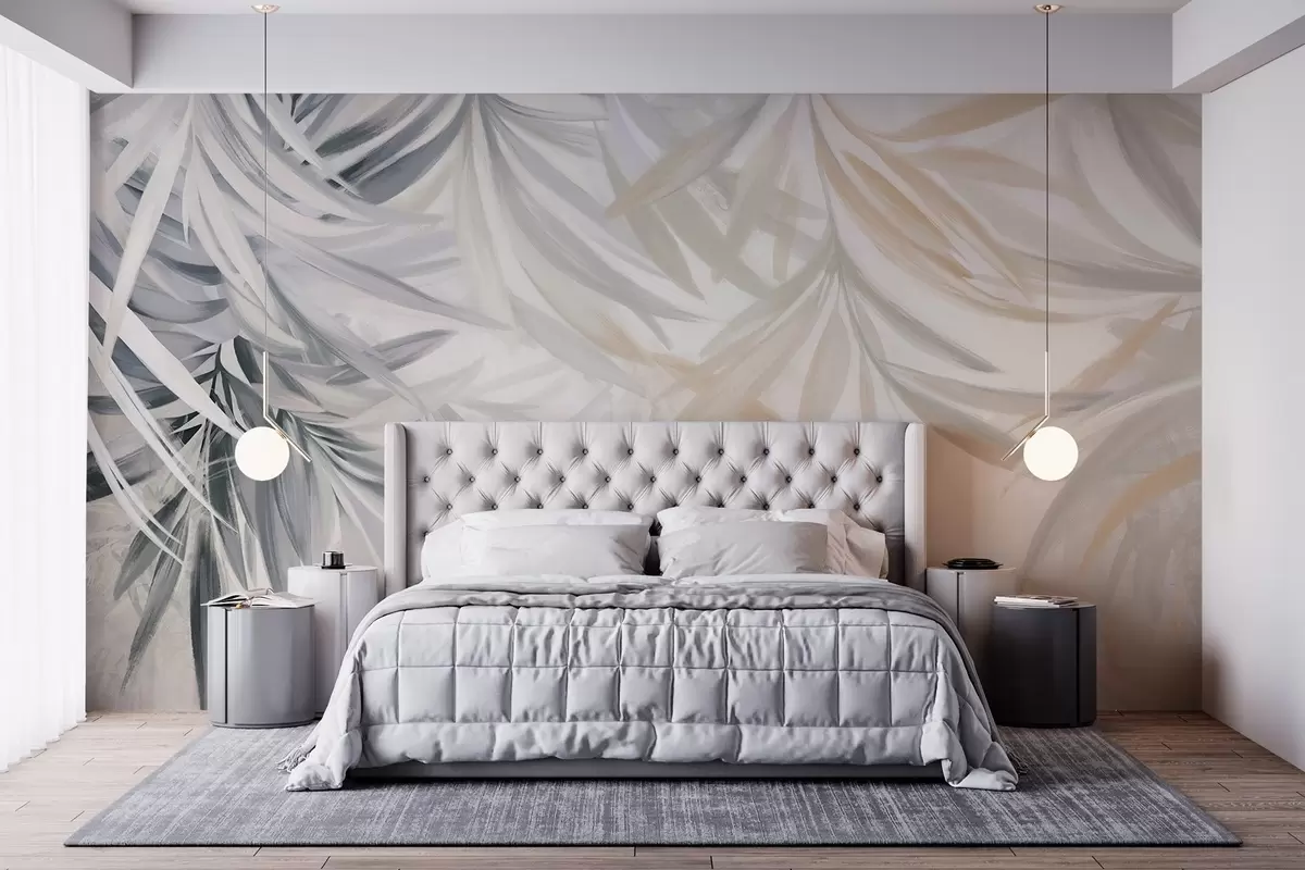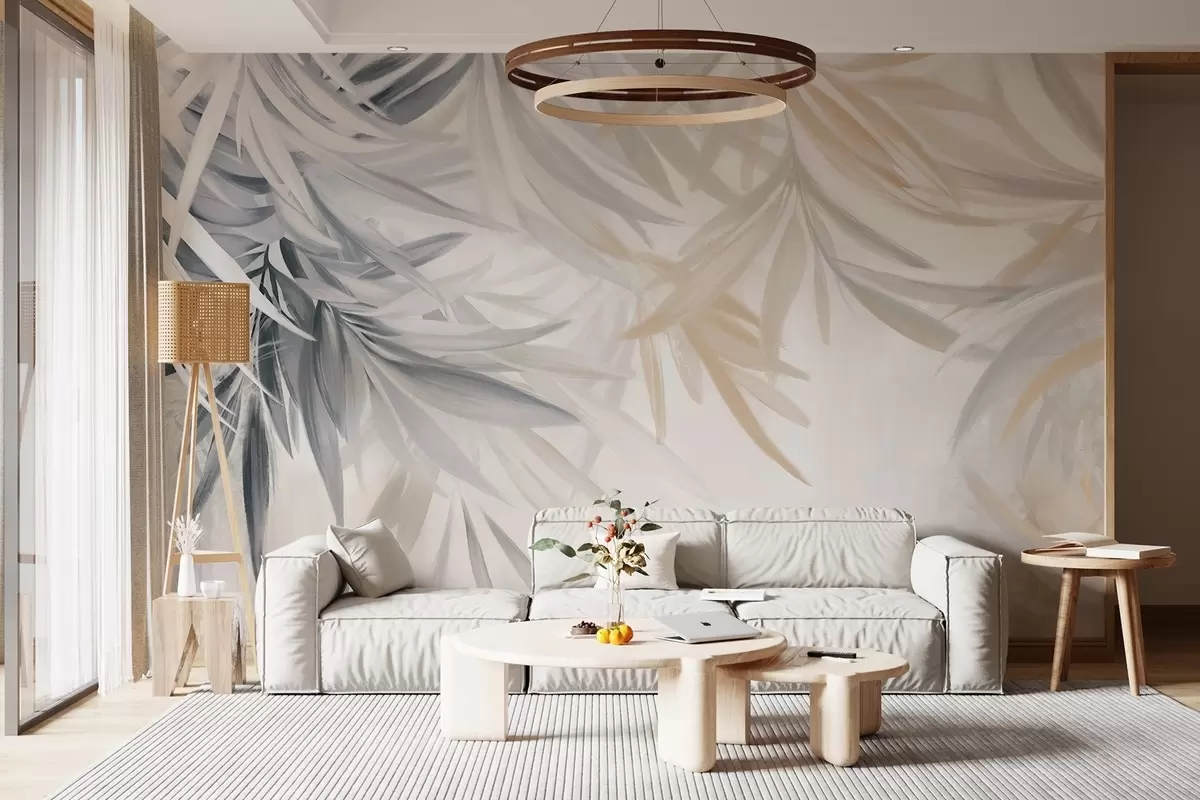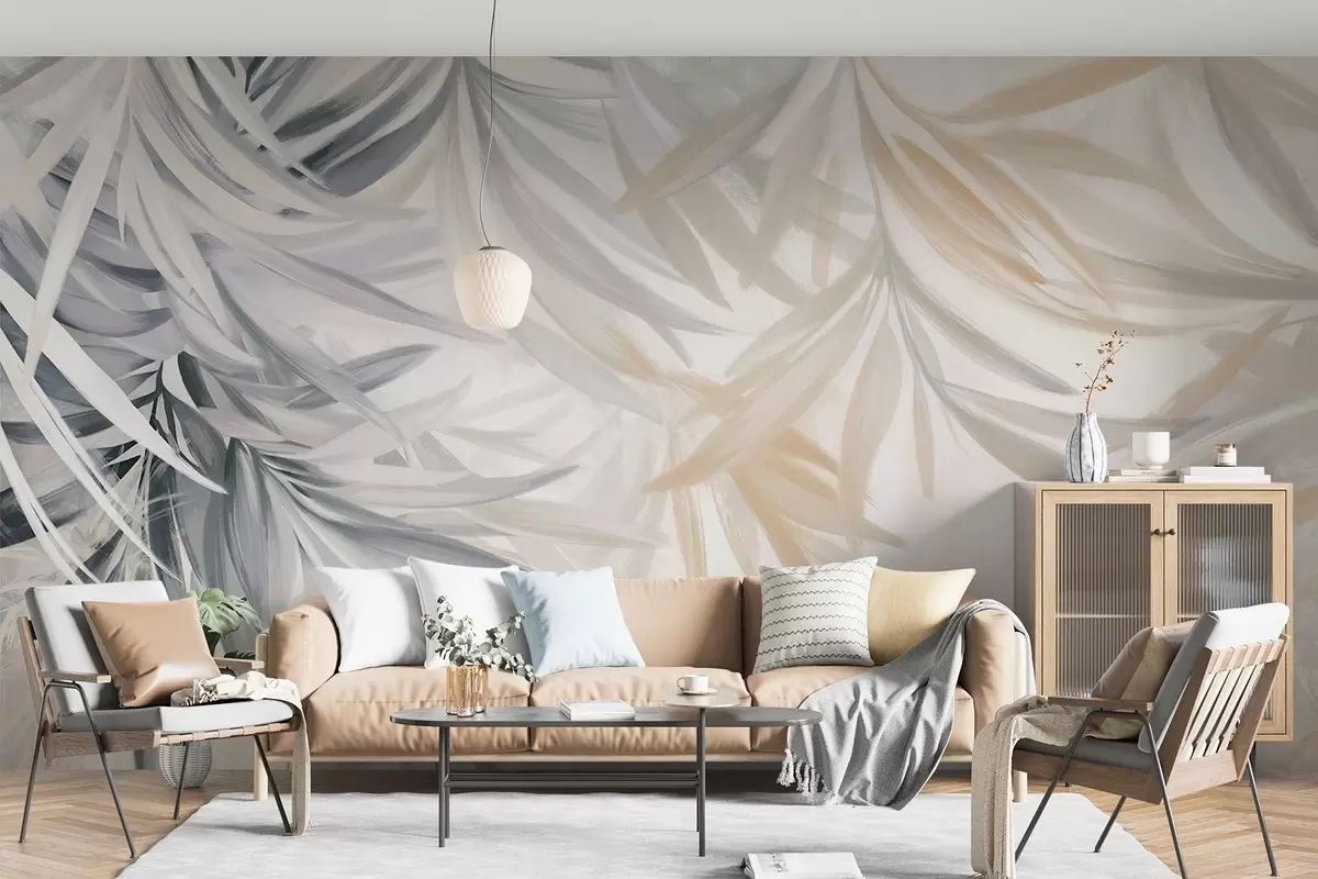 Тапете за зид Меко, тече тропско лишће светле боје у нијансама сиве и брескве, стапајући се у бледи, неутрални отисак бр. w08703