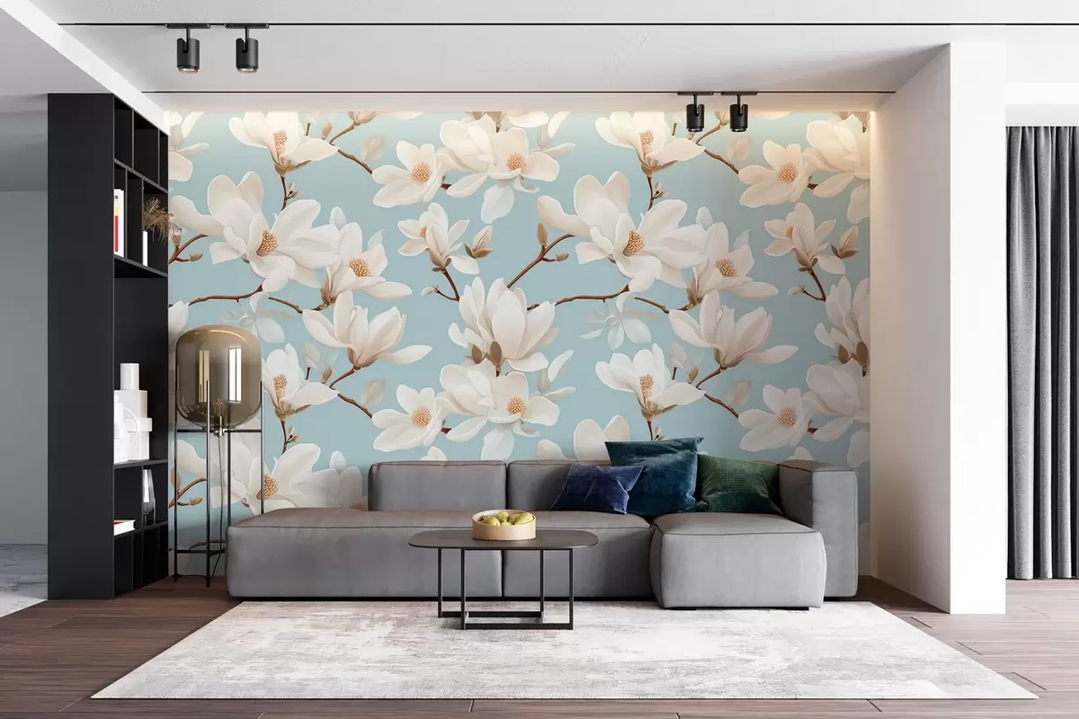 Тапете за зид Узорак цвећа беле магнолије, пастелно плава позадина, бело лишће и гране бр. w08726