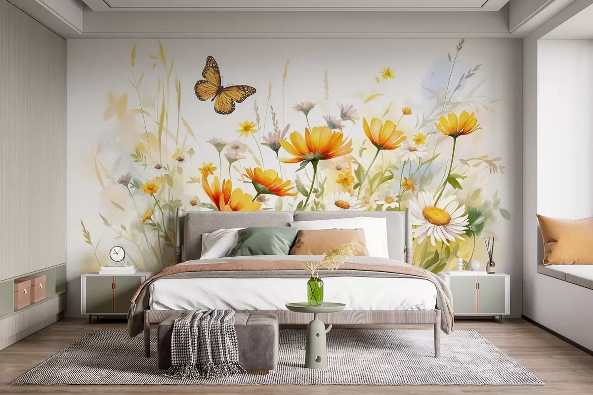 Тапете за зид Живо поље цвећа налик акварелу са наранџастим и жутим цветовима са лептиром изнад цвећа бр. w08739