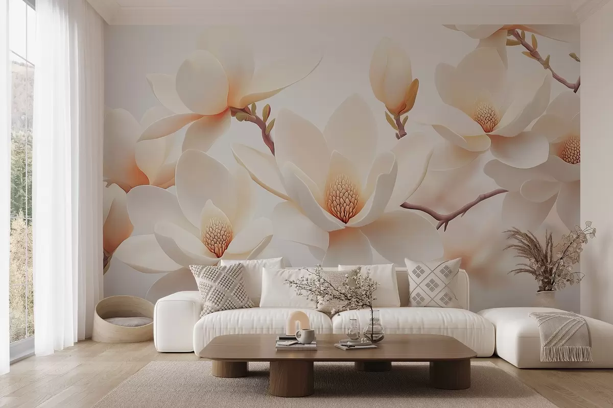Тапете за зид Цвеће магнолије крем боје на белој позадини бр. w08745