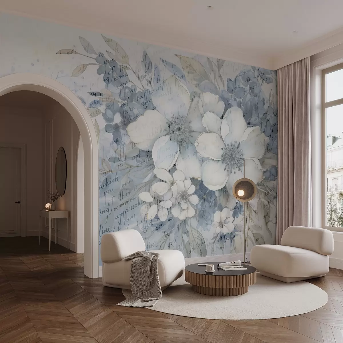 Тапете за зид Имитација меког зида са текстурираним белим и плавим цвећем, на бледој позадини са слабим руком писаним текстом бр. w08771