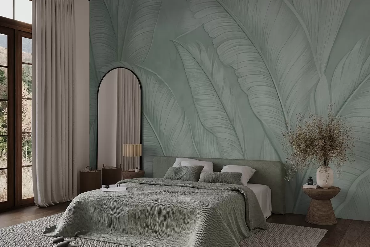 Тапете за зид Високо текстурирани детаљни велики тропски листови у монохроматској зеленој боји у стилу поткровља бр. w08772v1