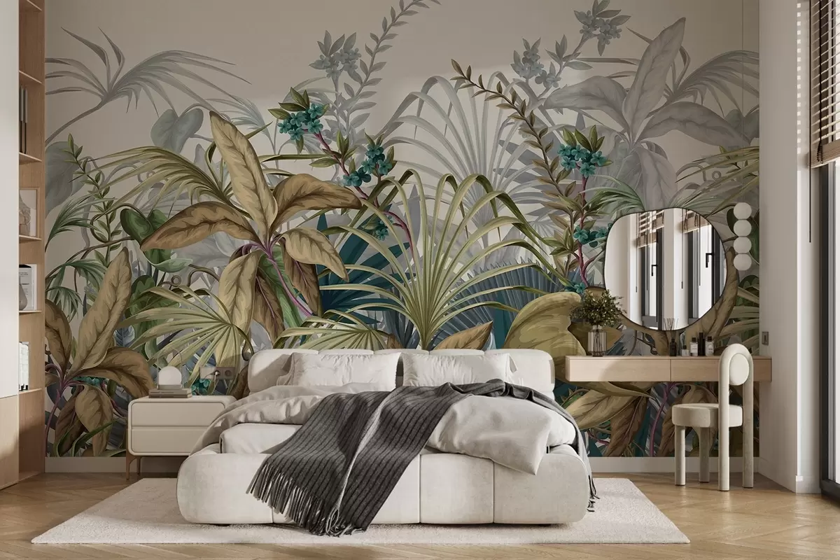 Тапете за зид Аранжман разних тропских биљака са великим живим листовима, стварајући бујну сцену лишћа на светло беж бр. w08777v1