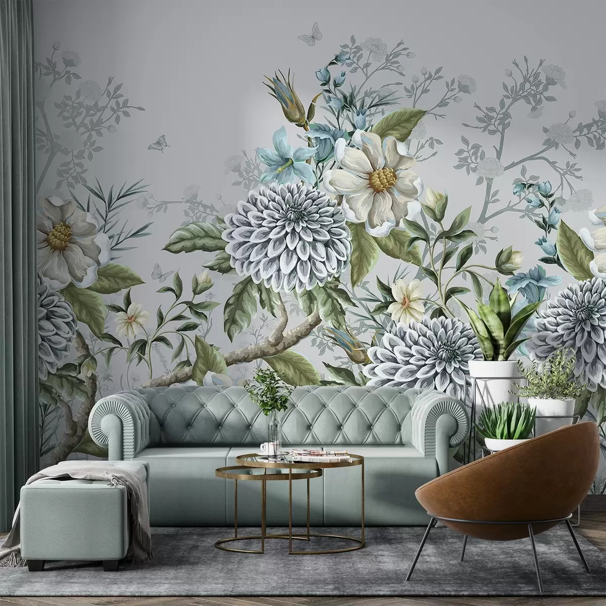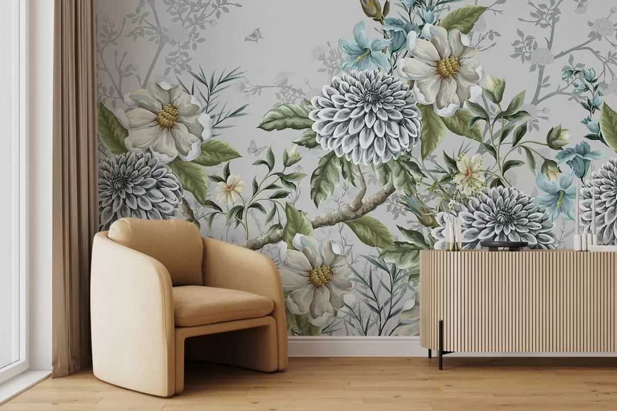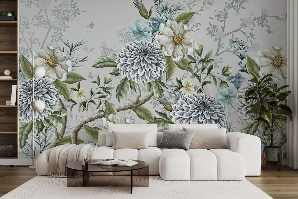 Тапете за зид Цветни принт са хризантемама, деликатним плавим цветовима и зеленим листовима испреплетеним са гранама бр. w08782