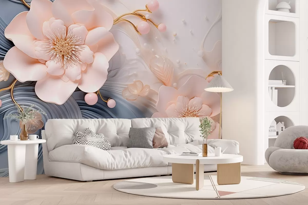 Тапете за зид 3Д дизајн позадине са ружичастим цвећем и бисерима на плавим и белим таласима бр. w08806