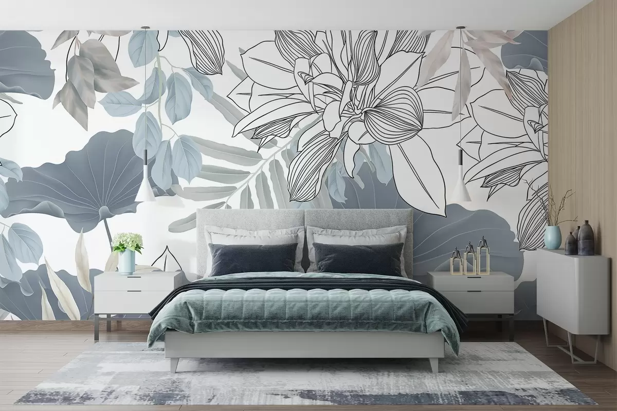 Тапете за зид Цветни принт са цветовима и листовима лотоса у плавој и белој боји на белој позадини бр. w08827