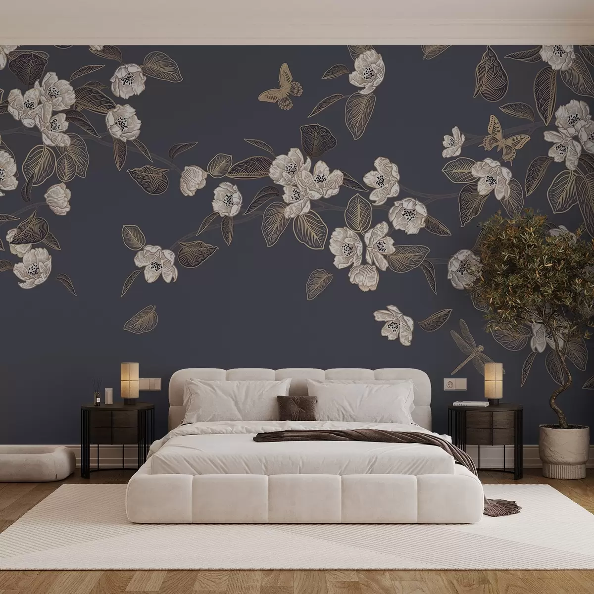 Тапете за зид Грана цвета трешње са цвећем, лишћем, лептирима на тамно сивој позадини бр. w08830