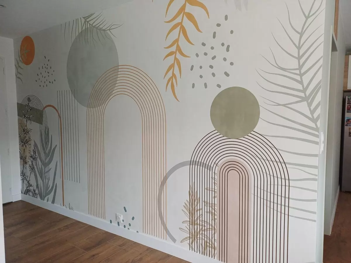 wall murals Апстрактна штампа са геометријским облицима, луковима и тропским листовима на белој позадини w08835