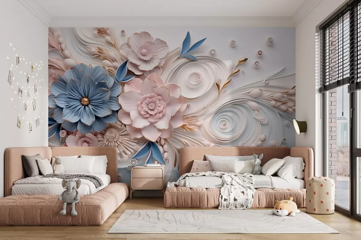 Тапете за зид Деликатна цветна композиција у розе и плавим тоновима са меком рељефном позадином бр. w08847