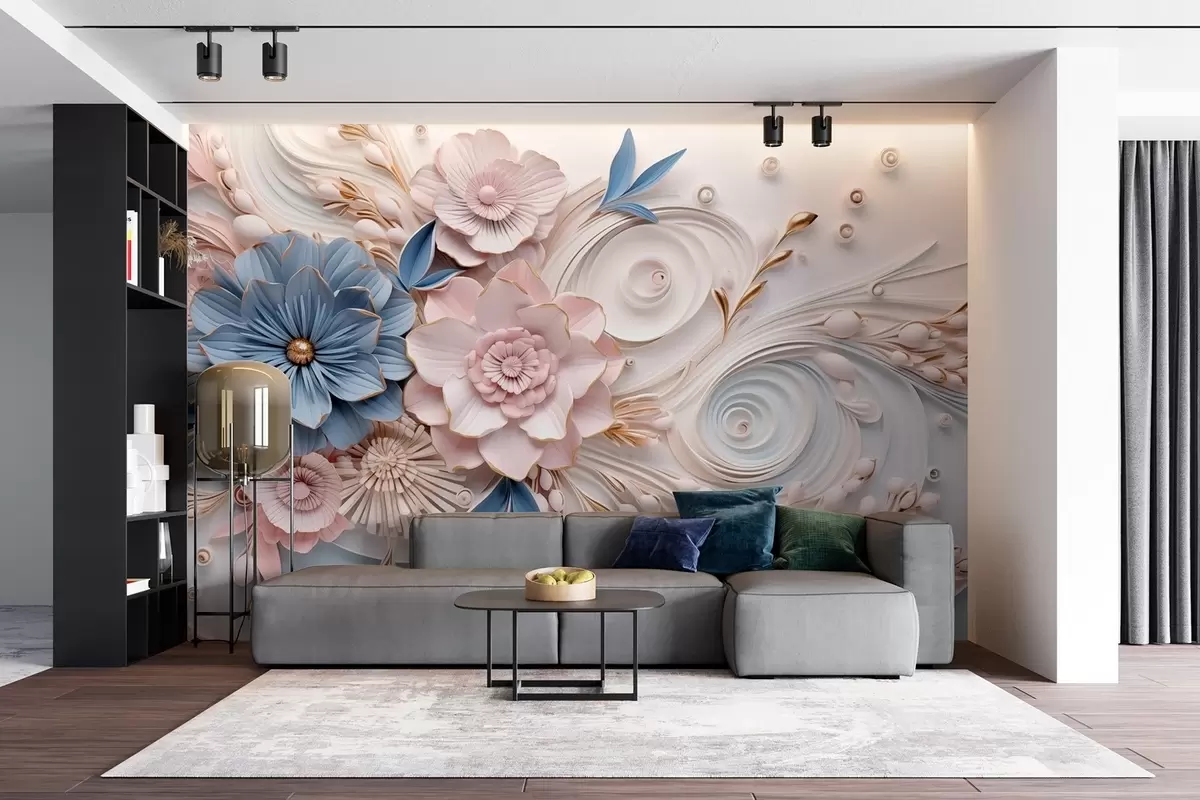 Тапете за зид Деликатна цветна композиција у розе и плавим тоновима са меком рељефном позадином бр. w08847