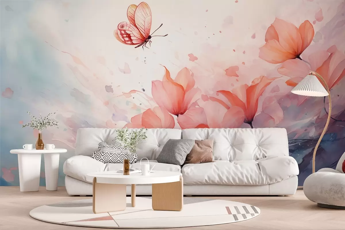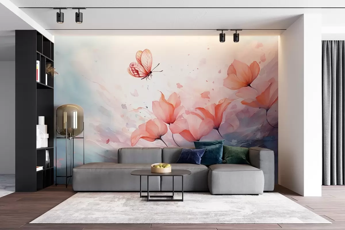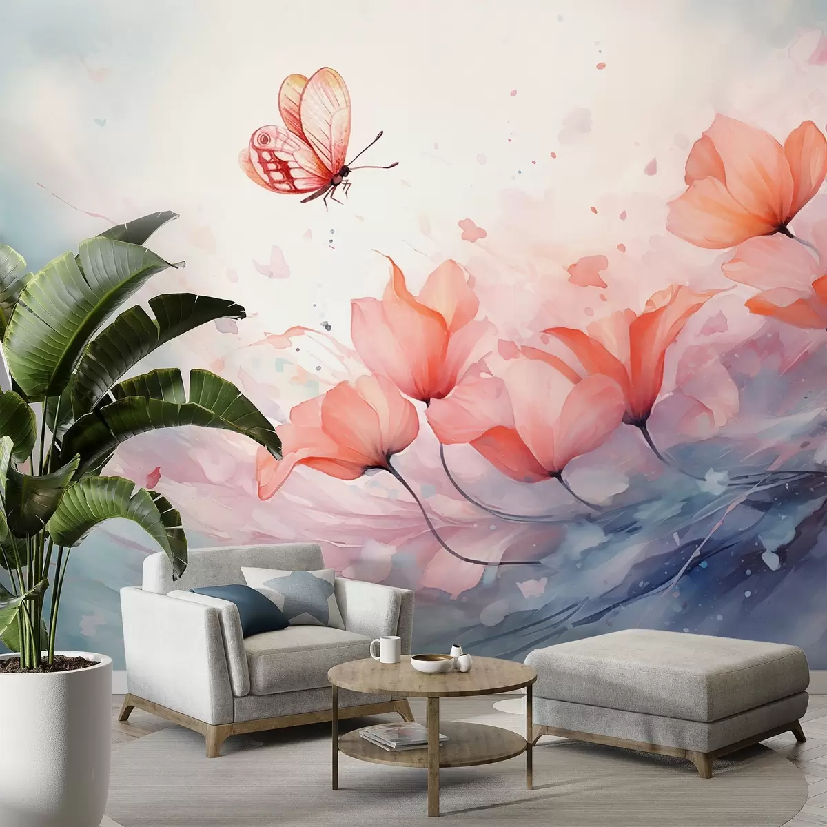 Тапете за зид Нежни макови са лептиром у стилу акварела бр. w08849