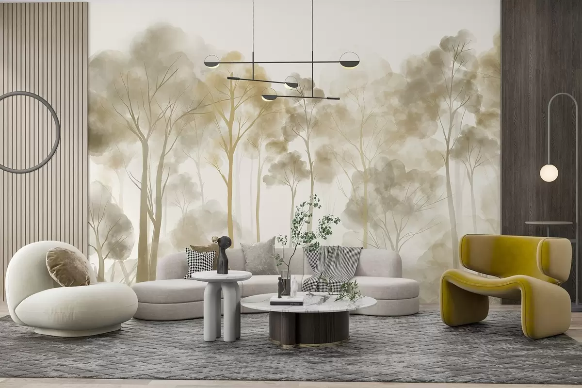Тапете за зид Шума у акварел стилу са високим светлим дрвећем у нијансама беж и жуте, са магловитом атмосфером бр. w08870