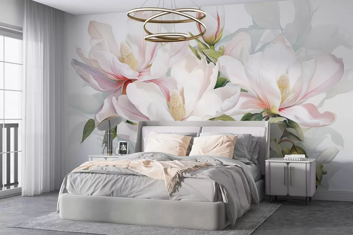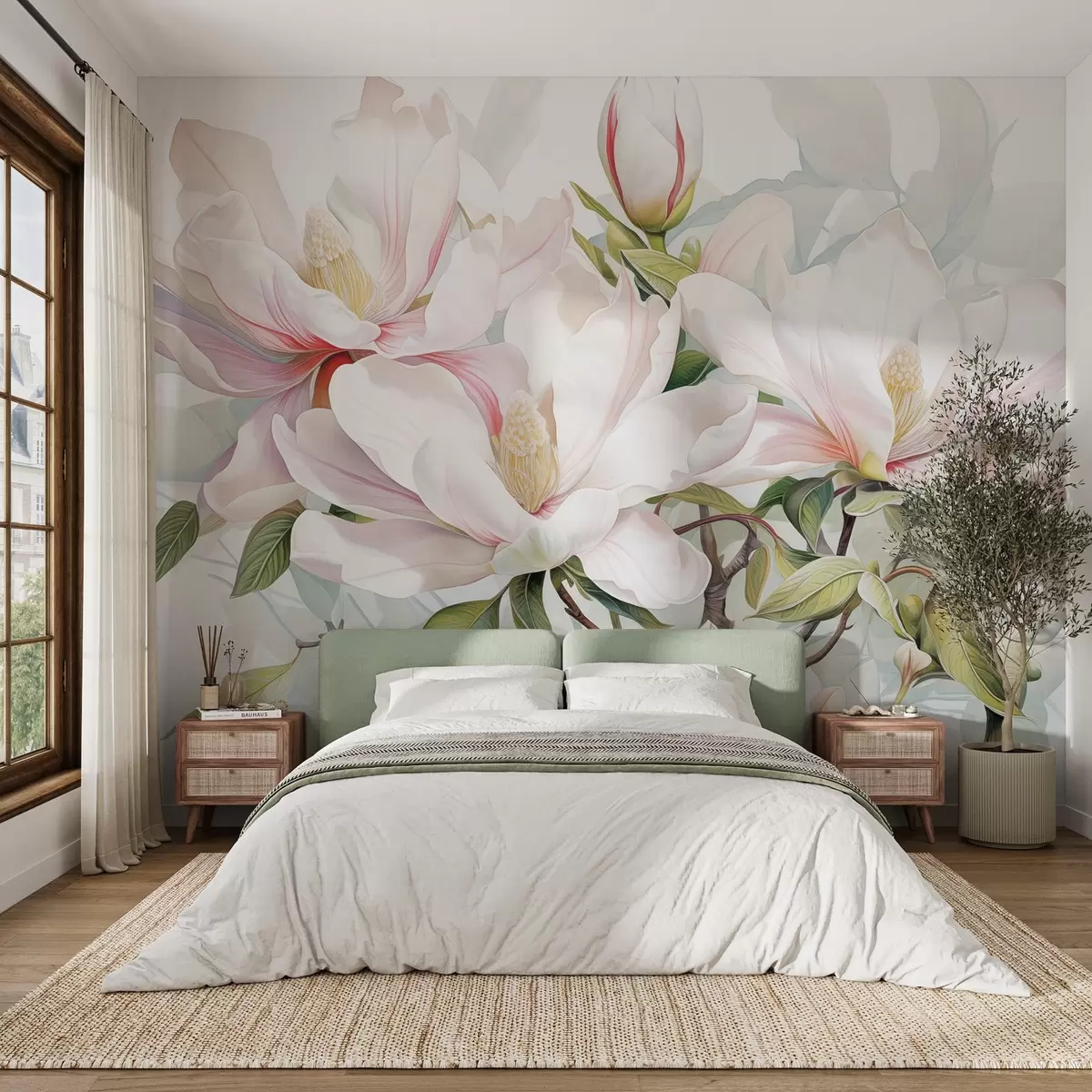 Тапете за зид Цвеће магнолије са белим и ружичастим латицама, листовима и браон гранама, меког и деликатног стила акварела бр. w08885
