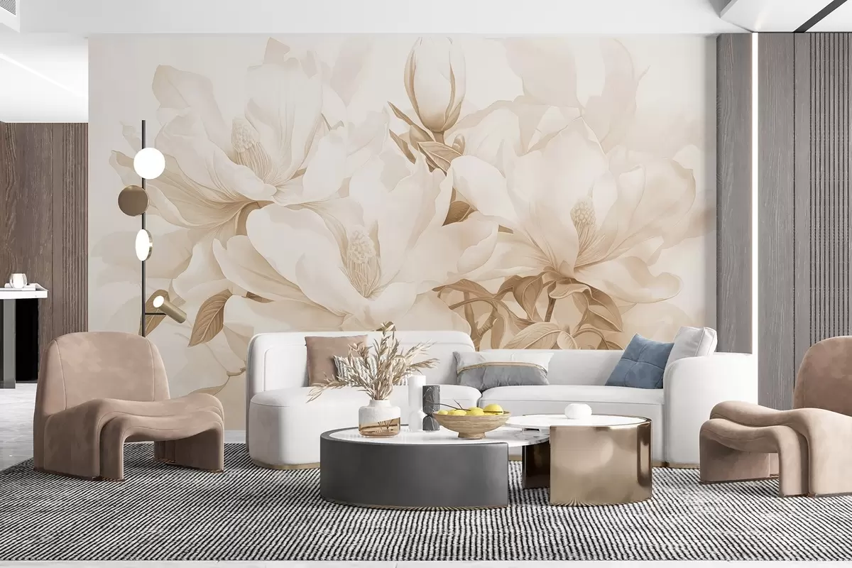 Тапете за зид Цвеће магнолије са белим и беж латицама, листовима и браон гранама, меког и деликатног стила акварела бр. w08886