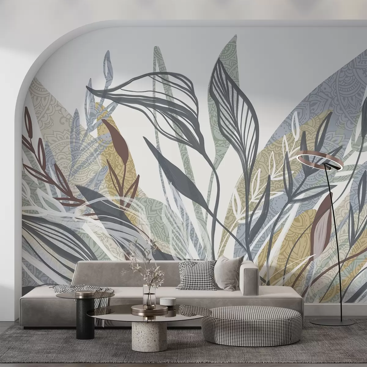Тапете за зид Колекција листова различитих боја и величина, од којих неки имају линијску уметност, на белој позадини бр. w08893