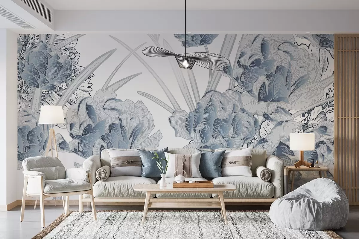 Тапете за зид Плави божури са листовима на белој позадини, цветни дизајн, ботаничка илустрација бр. w08896