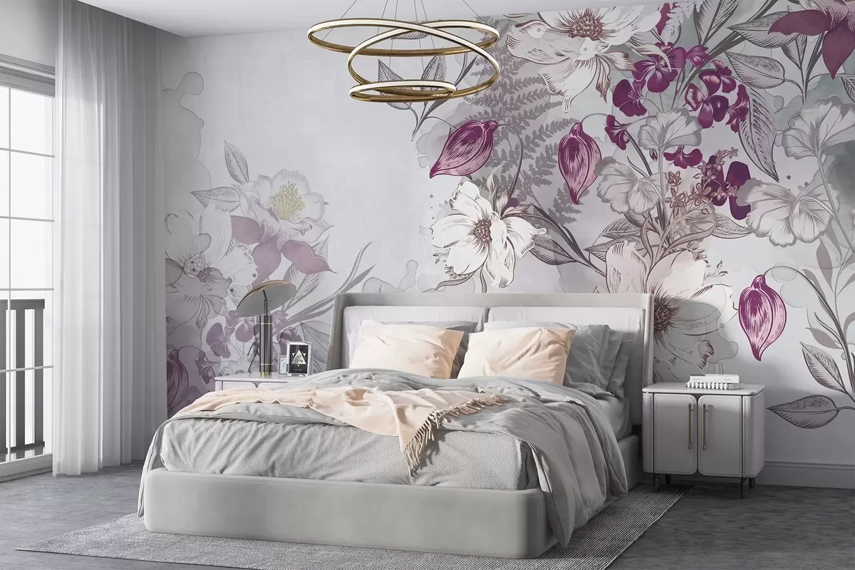 Тапете за зид Цвеће са белим и љубичастим латицама, листовима и стабљикама, ефекат акварела, светло сива текстурирана позадина бр. w08899