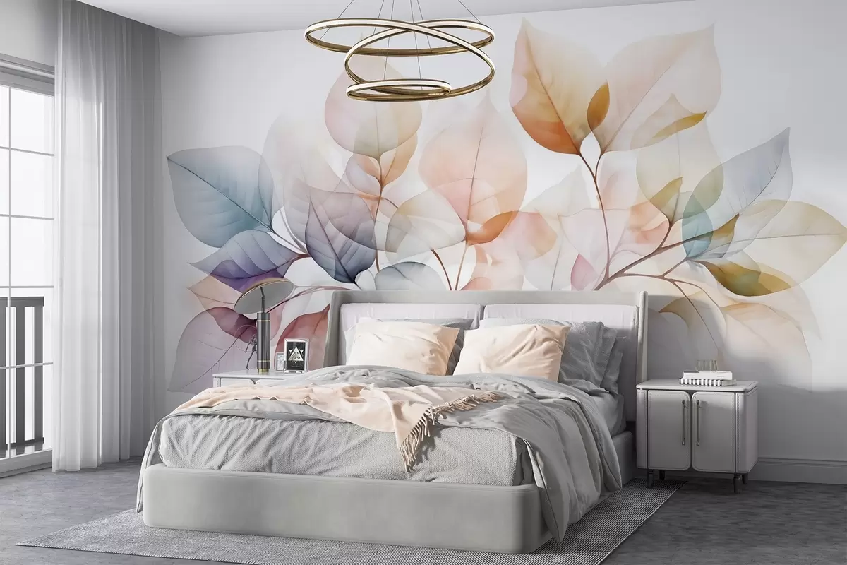 Тапете за зид Акварел слика прозирног лишћа у пастелним бојама, са нијансама розе, беле, љубичасте и плаве бр. w08910