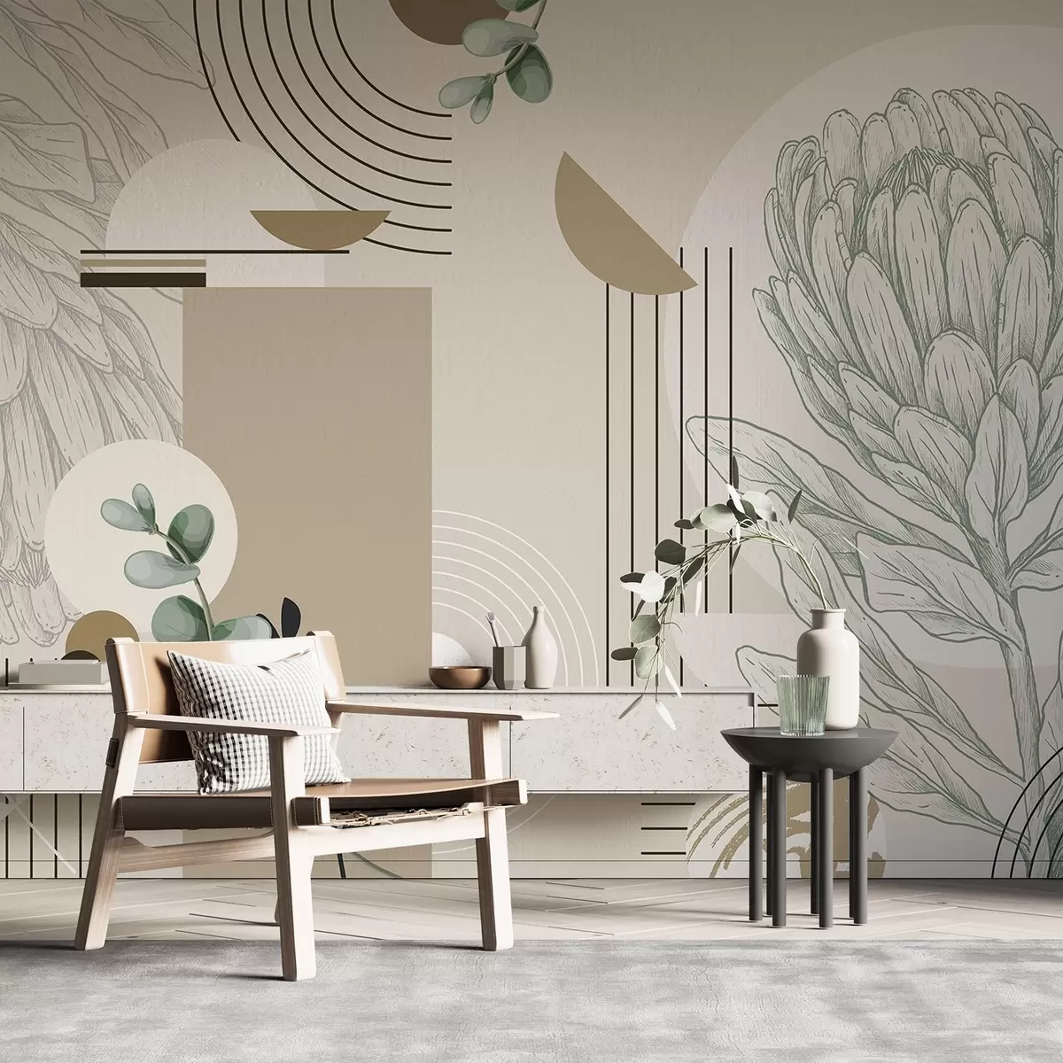 Тапете за зид Апстрактни ботанички принт са цветом протеа, листовима еукалиптуса, геометријским облицима у минималистичком стилу, пастелним бојама бр. w08914