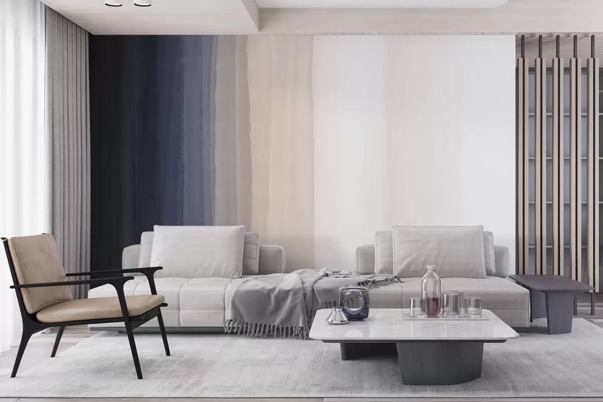 Тапете за зид Апстрактни минималистички градијент принт са вертикалним пругама тамноплаве, светло брескве и беле боје бр. w08915v1