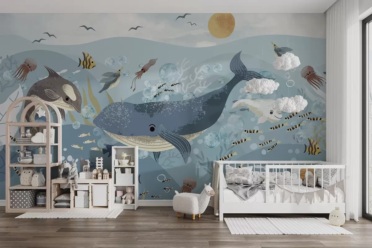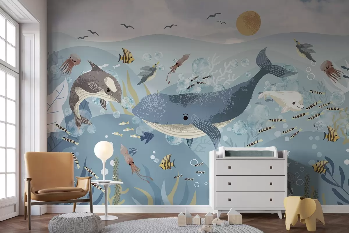 Тапете за зид Дечија илустрација слатка штампа са плавим китом окруженом рибама, лигњама, медузама у плавом океану са мехурићима бр. w08921