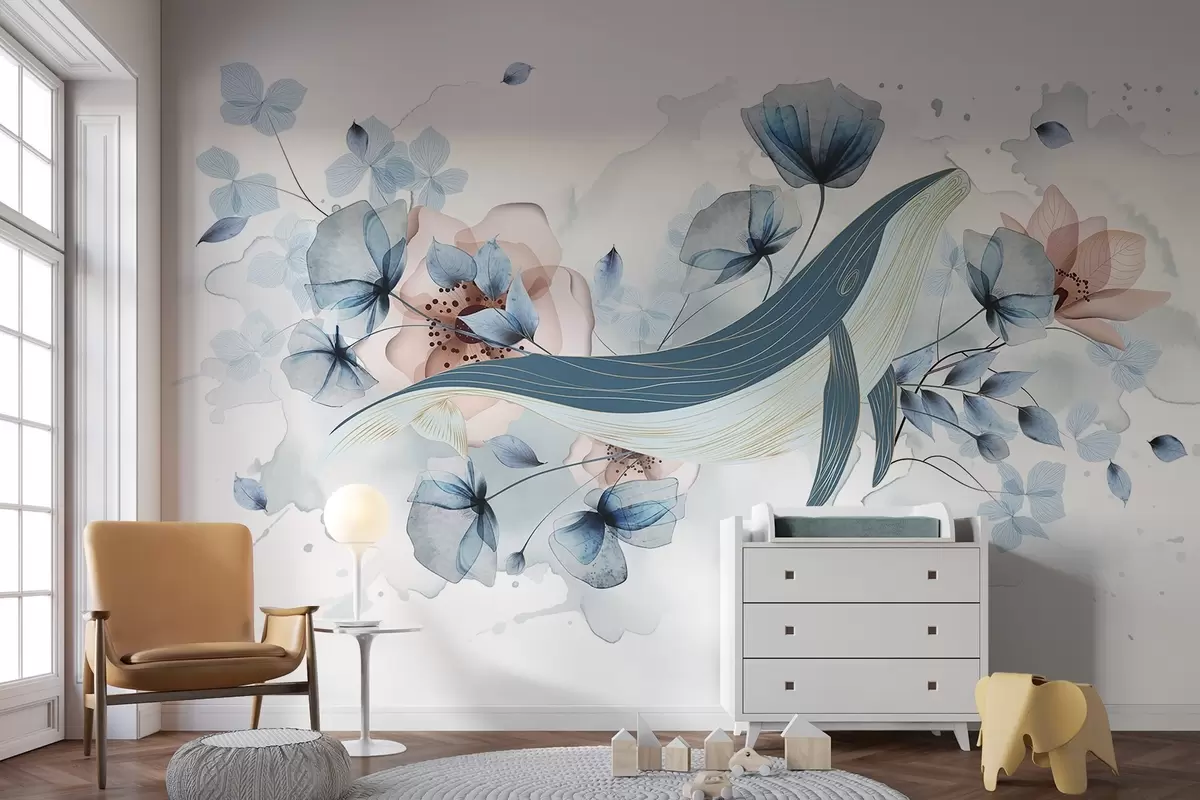 Тапете за зид Плави кит са цвећем, стил акварела, светло плаве и розе боје, светла позадина бр. w08922