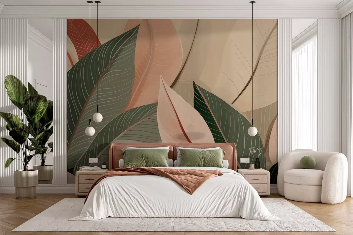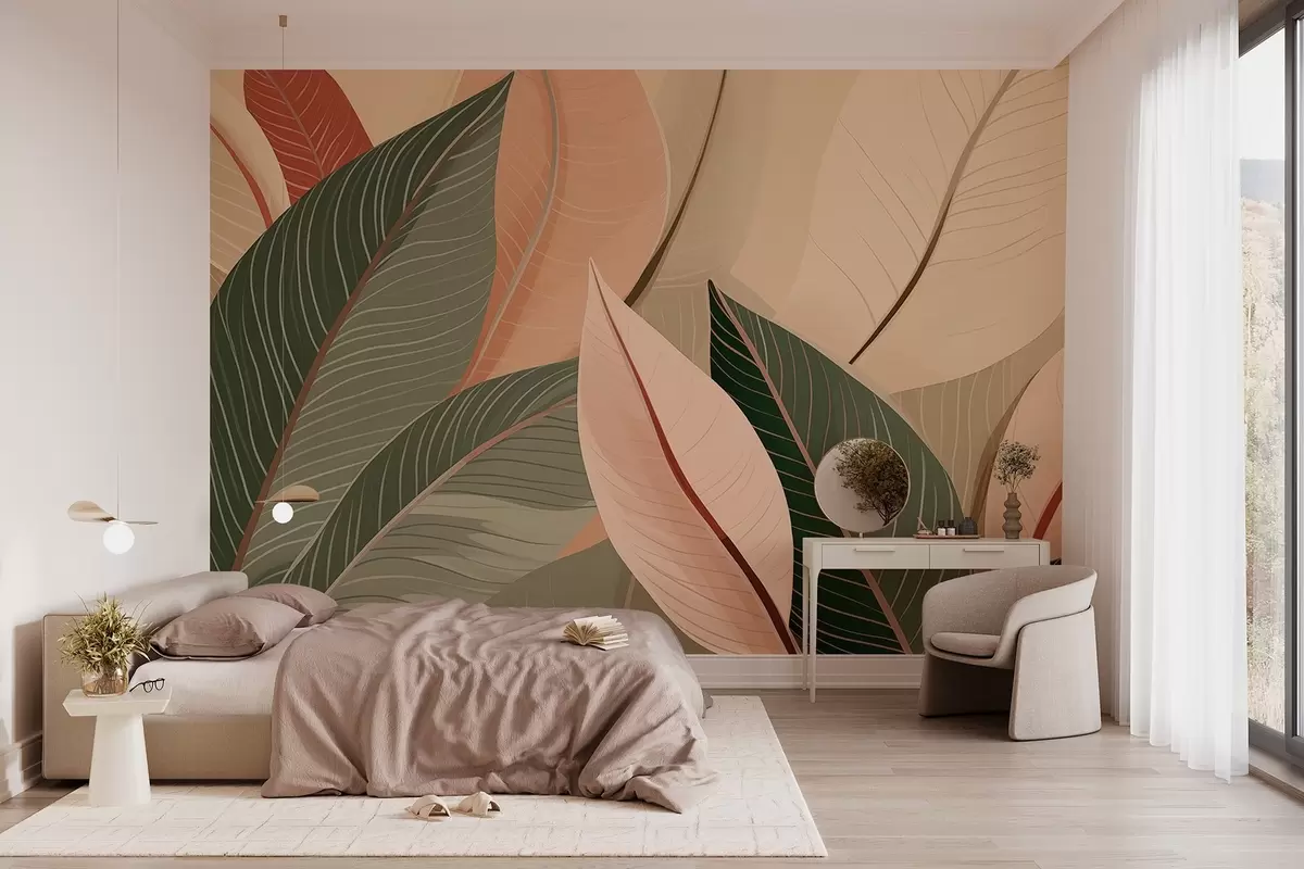 Тапете за зид Крупни план листова маслинасто зелене и розе-крем боје бр. w08944