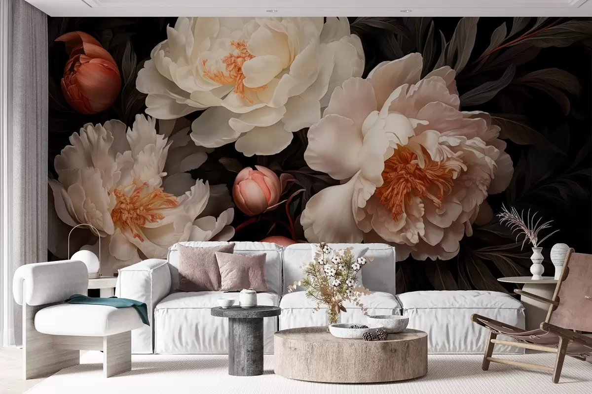 Тапете за зид Бели велики божури са црвеним пупољцима на тамној позадини бр. w08965