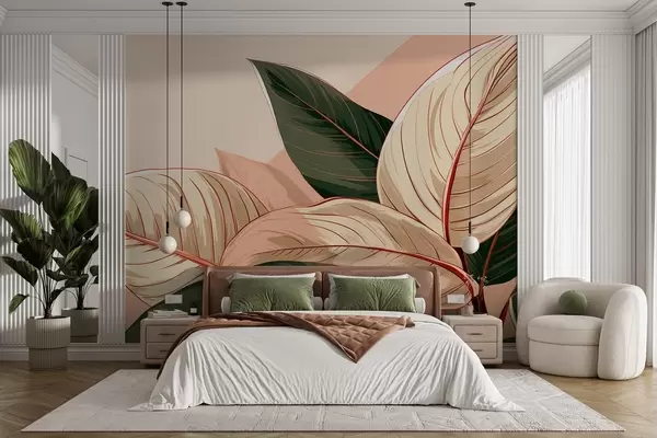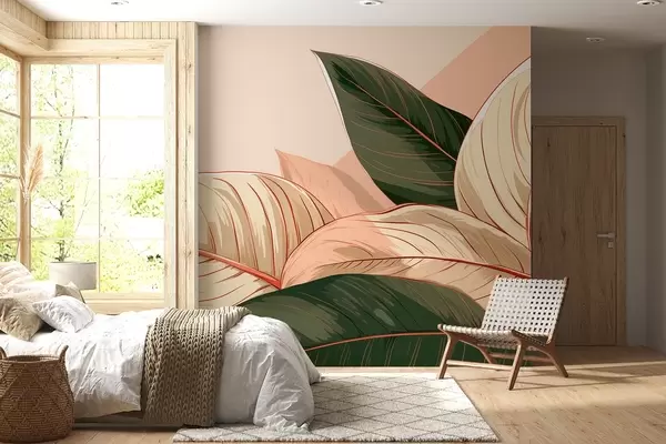 Тапете за зид Зелено-беж велики тропски листови са ружичастим фрагментом бр. w08970