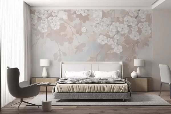 Тапете за зид Гране цвета трешње са белим цветовима и сивим листовима, на елегантним цветним силуетама у нежним пастелним бојама бр. w08973
