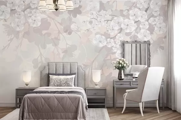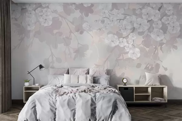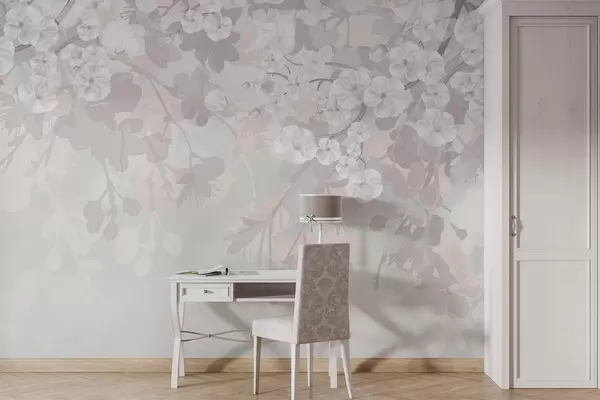 Тапете за зид Гране цвета трешње са белим цветовима и сивим листовима, на елегантним цветним силуетама у нежним пастелним бојама бр. w08973v1