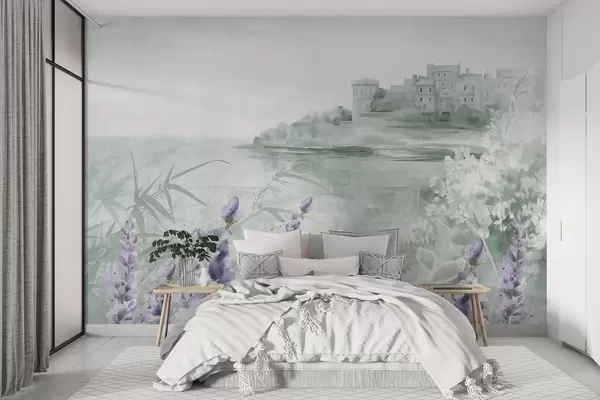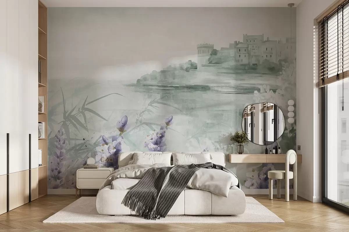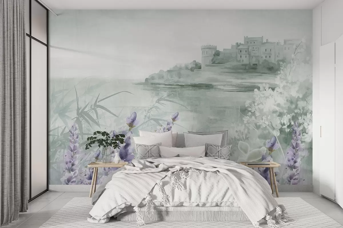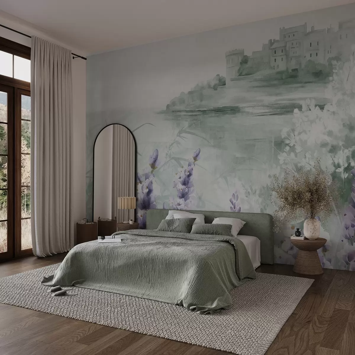 Тапете за зид Текстурирани старински пејзаж са замком на литици са погледом на море, са цветовима лаванде у пригушеним бојама бр. w08975
