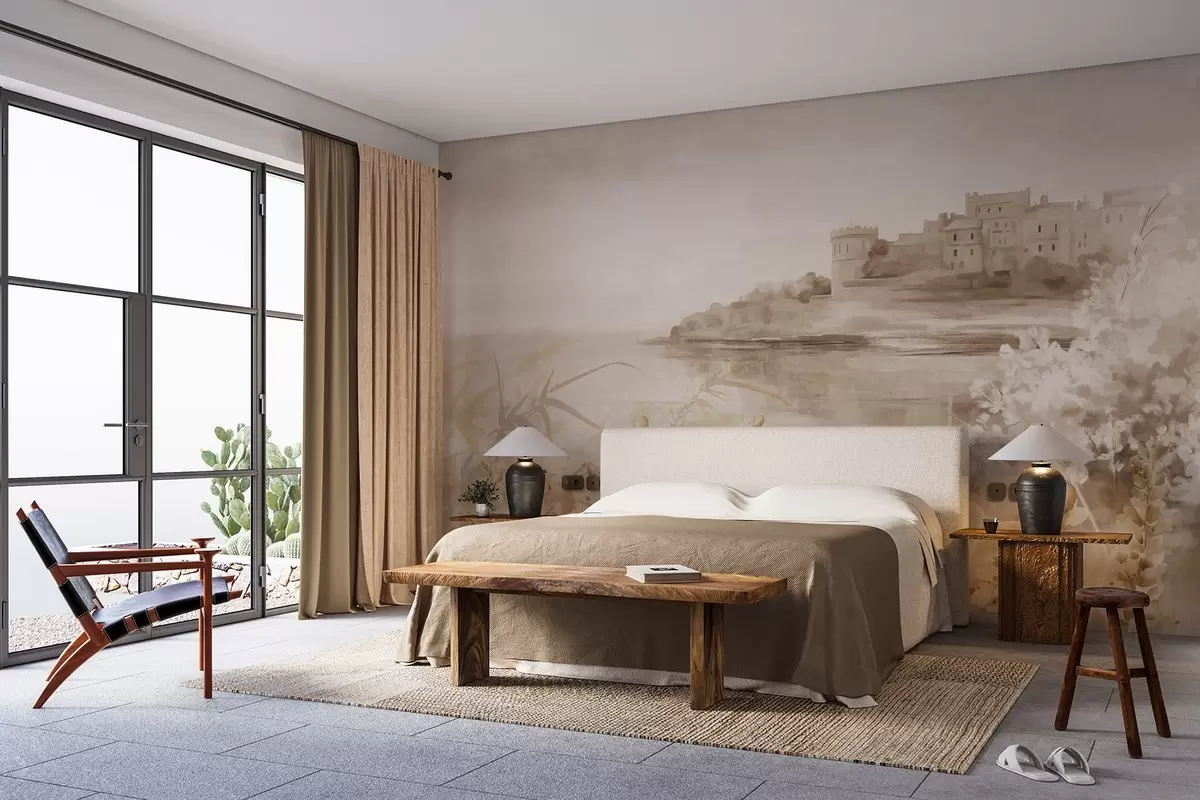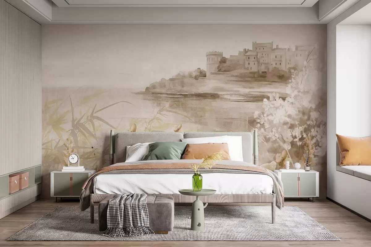 Тапете за зид Текстурирани старински пејзаж са замком на литици са погледом на море, са цветовима лаванде у пригушеним бојама бр. w08975v1