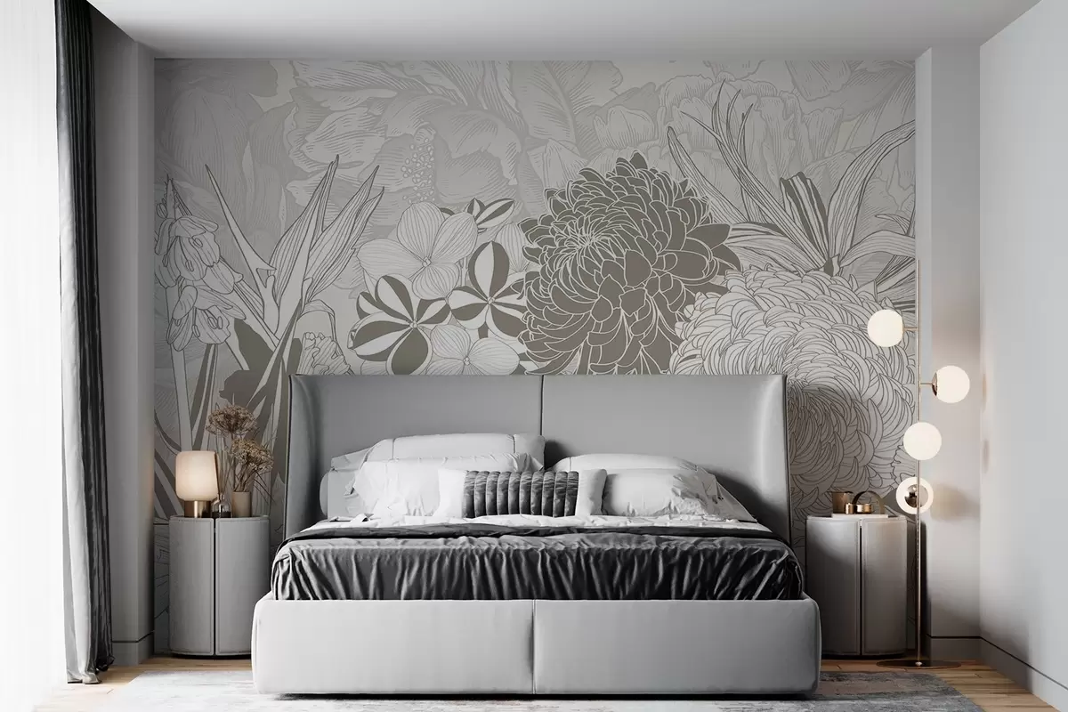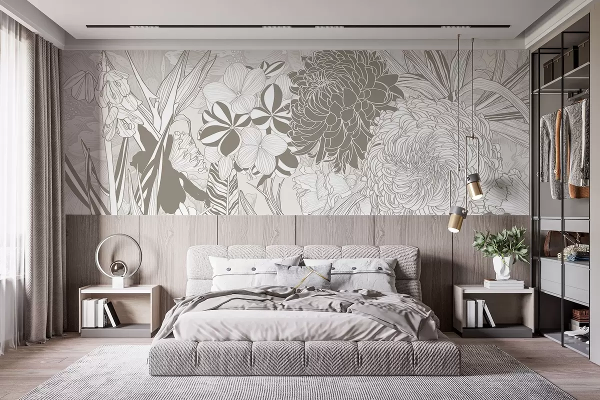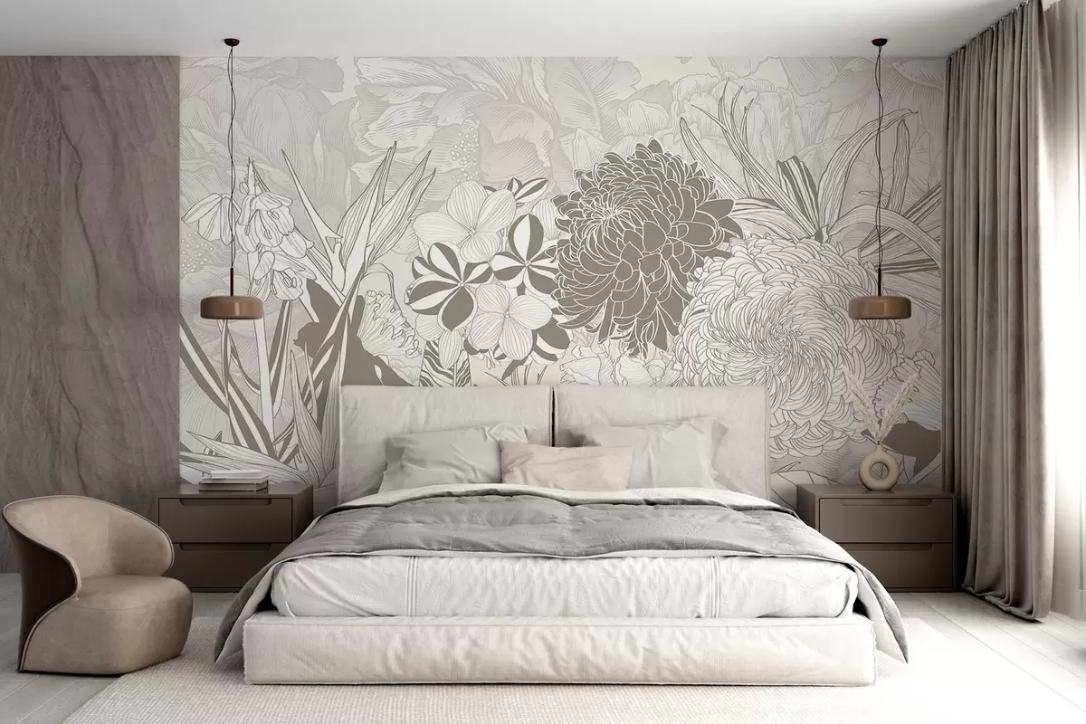 Тапете за зид Цвеће и лишће у беж тоновима, укључујући хризантеме, плумерију и тропско лишће, ботанички дизајн бр. w08976