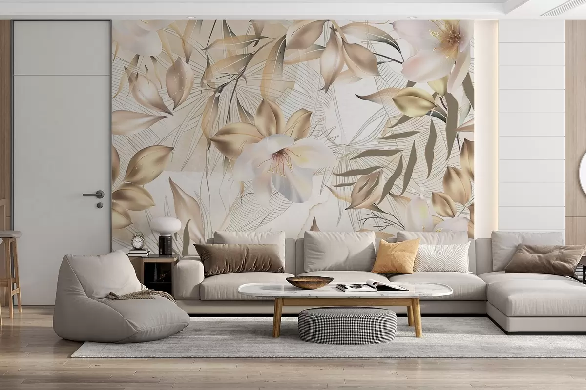 wall murals Цвеће и листови јасмина, нежне боје, ботаничка илустрација, цветна позадина, елегантан дизајн, деликатне латице w08977