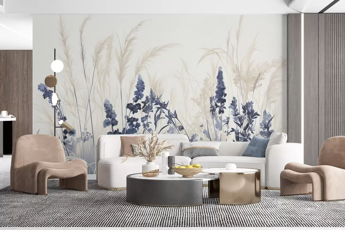 Тапете за зид Плаво цвеће и беж трска у пољу, минималистичка текстура сликања, светла позадина, меке боје, деликатни потези четкицом бр. w08982