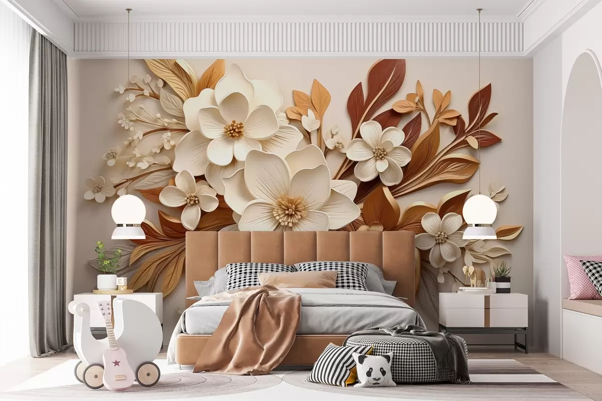 Тапете за зид 3Д цвеће са листовима у оригами стилу у беж тоновима бр. w08984