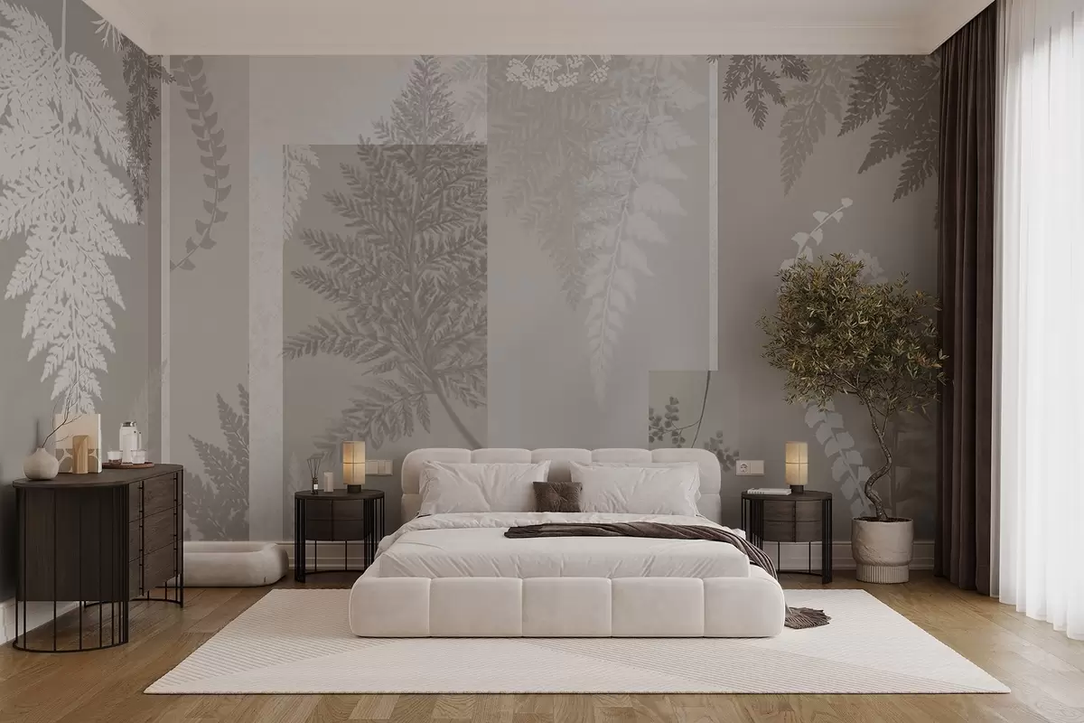 Тапете за зид Листови папрати у беж и белој боји, поређани у вертикалне пруге, стварајући ботанички и минималистички принт, меких и пригушених боја бр. w09007