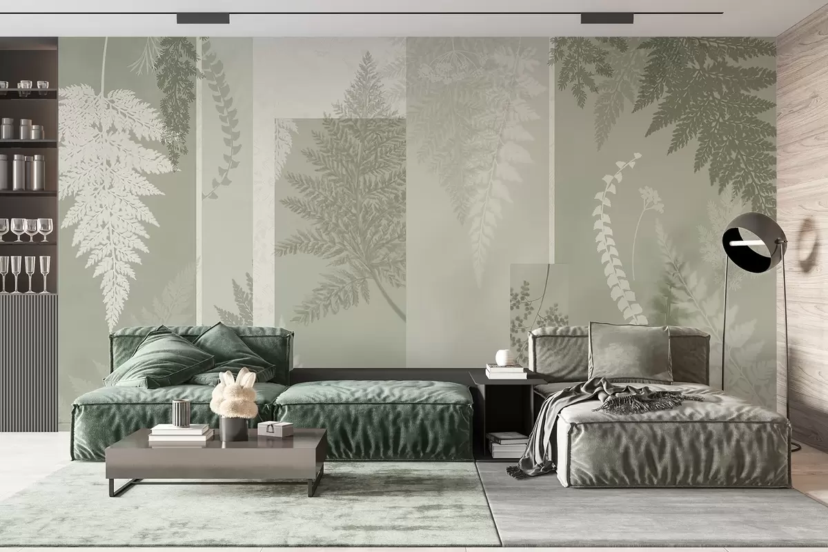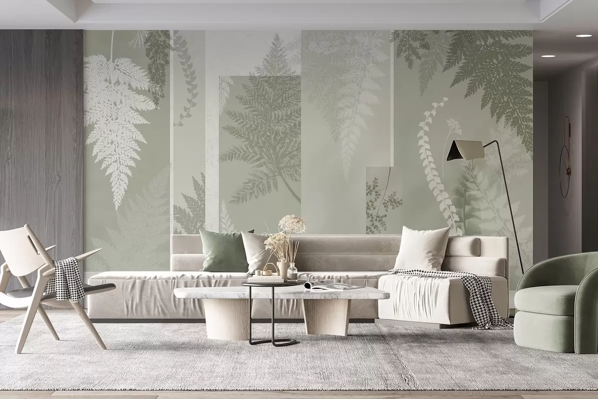 Тапете за зид Листови папрати у зелено-белој боји, поређани у вертикалне пруге, стварајући ботанички и минималистички принт, меких и пригушених боја бр. w09007v2