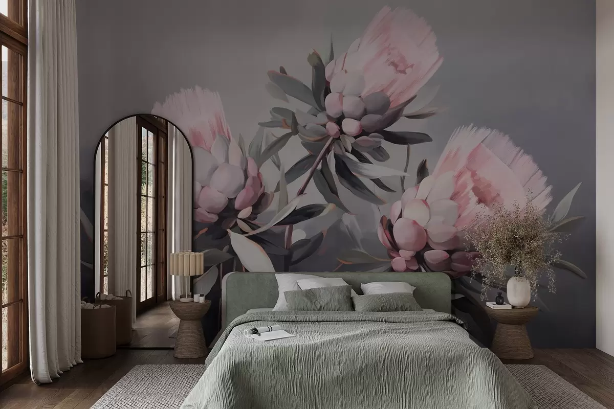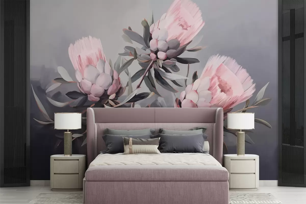 Тапете за зид Розе протеа апстрактно цвеће са сивим листовима, меким потезима четкице, пригушеним бојама, на замућеној сивој позадини бр. w09014