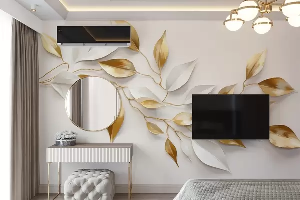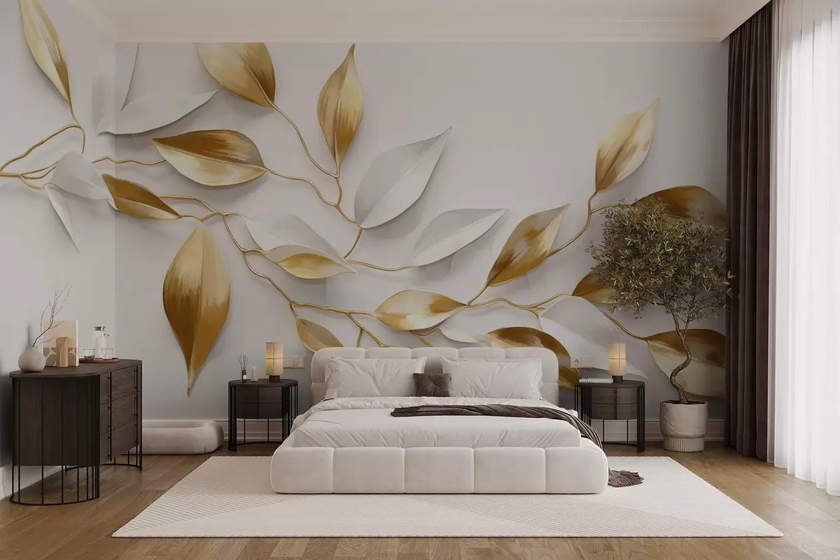 Тапете за зид Жуто и бело лишће на грани, елегантан дизајн, бела позадина, минималистички стил, декоративна уметност, инспирисан природом бр. w09015