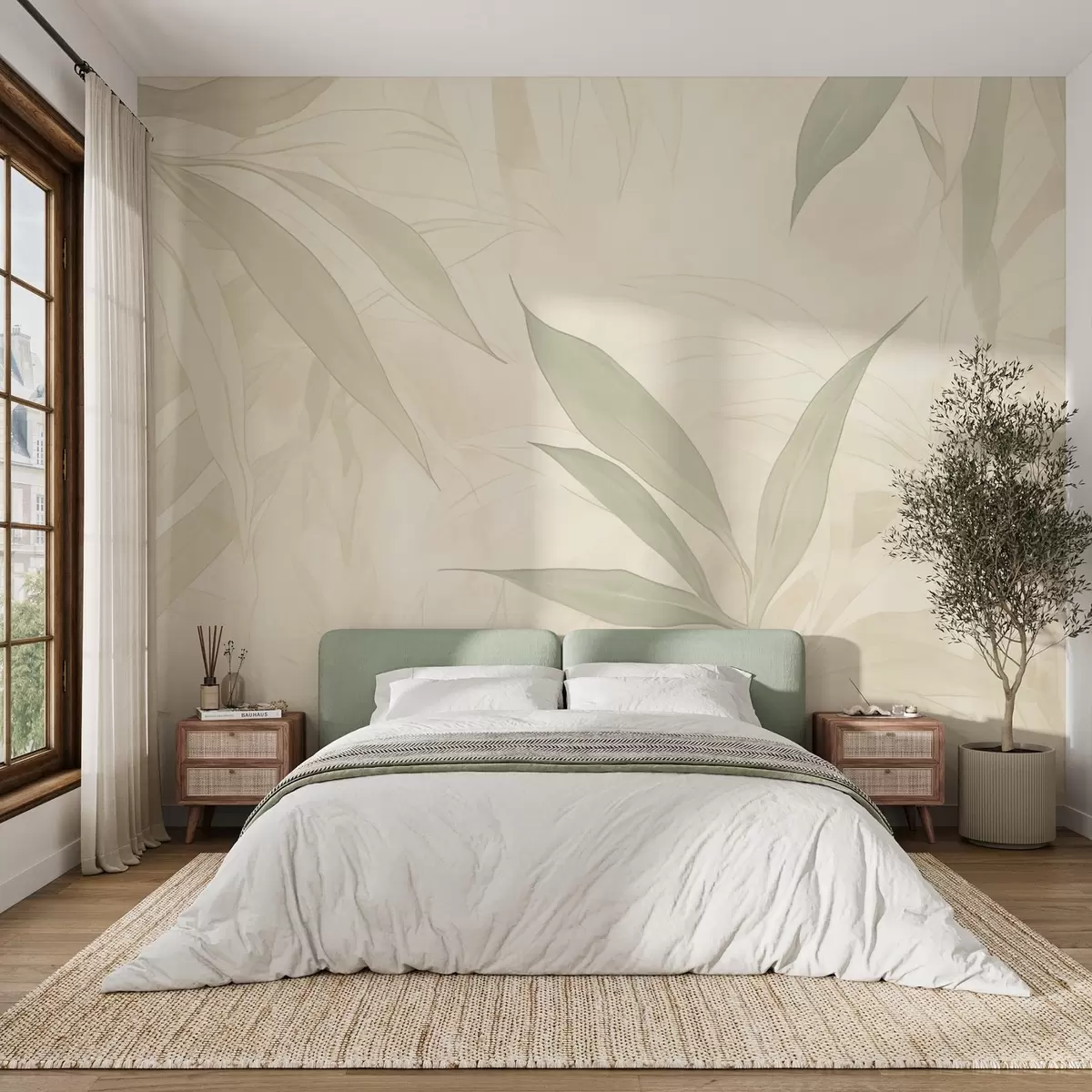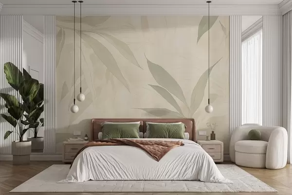 Тапете за зид Гране са листовима у меким зеленим тоновима на беж позадини бр. w09027