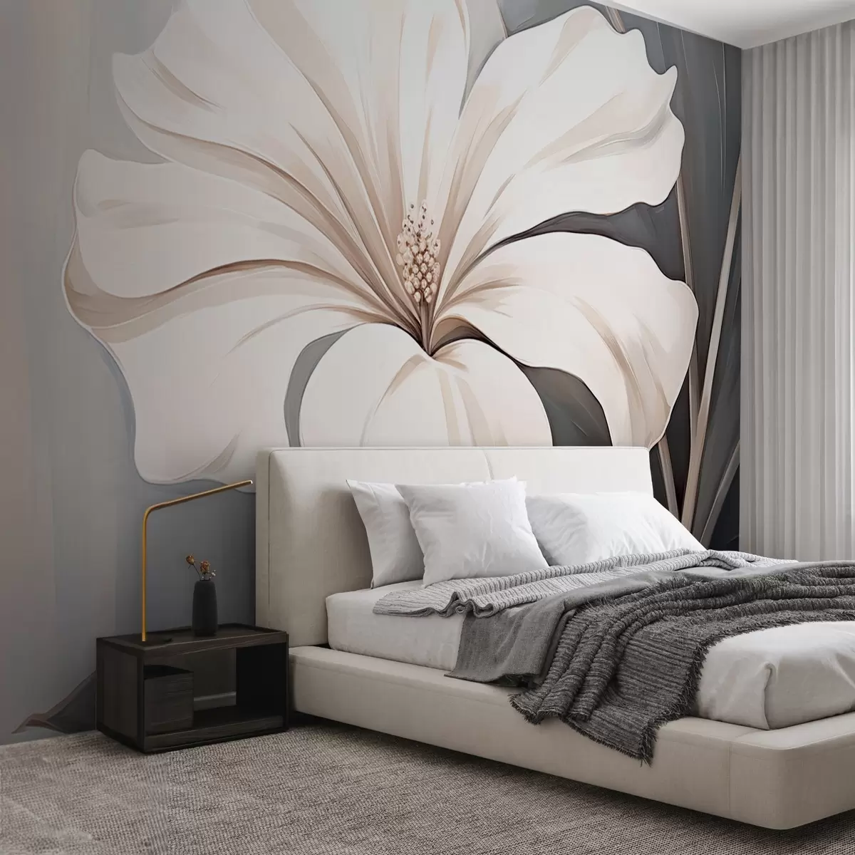 Тапете за зид Велики бели цвет са латицама на плаво-сивој позадини бр. w09033