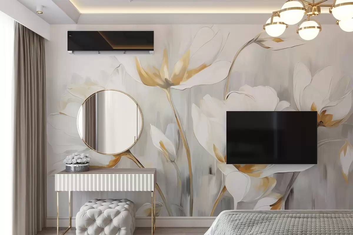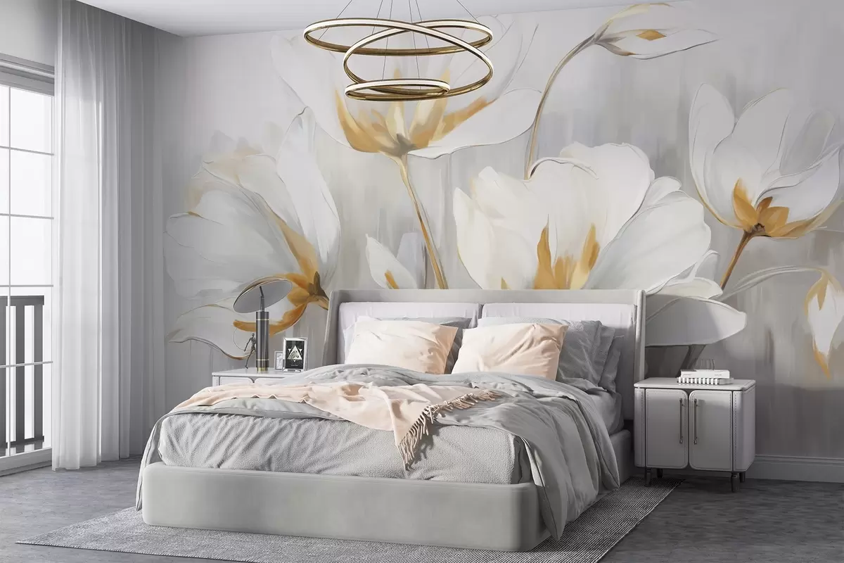 Тапете за зид Бело апстрактно цвеће са белим латицама и стабљикама на сивој позадини са сивим и белим вертикалним потезима бр. w09047